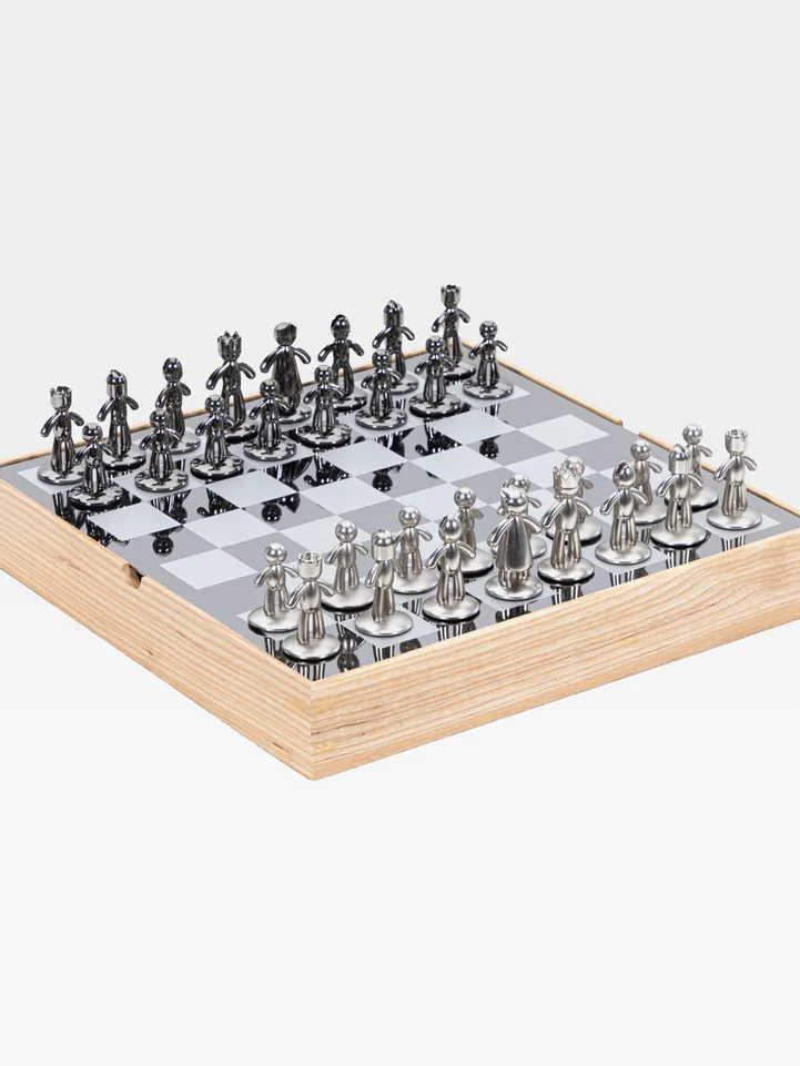 Buddy Chess Set is an elegant addition to any space, able to serve as eye-catching decor when not in use. It sports polished black and charcoal tiles and cast zinc chess pieces with nickel and titanium finishes. The board's glossy coating, in combination with the velvet lining under the individual pieces allows for optimal movement of the Buddy chess pieces.