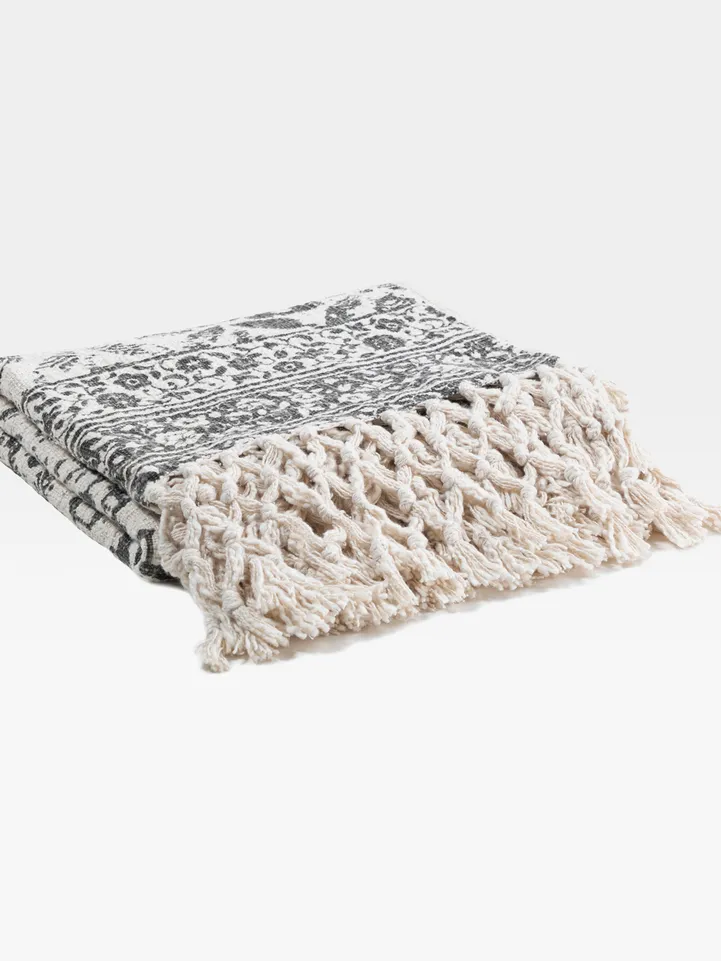 Our handwoven and printed throw, made from 100% cotton in natural and black, is crafted by skilled artisans who weave each thread with precision and care. The 100% cotton composition ensures a soft and cozy texture.