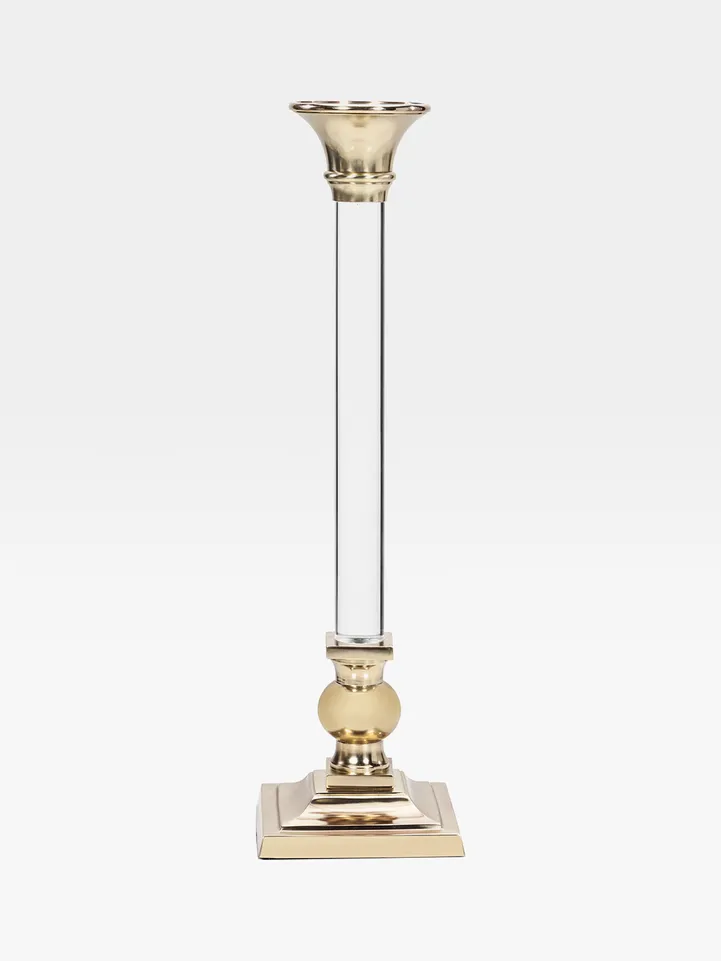 The stunning Lucite Candle Holder artfully combines classic elegance with contemporary flair, featuring a sleek design crafted from lustrous brass and clear acrylic. This exquisite piece elevates any setting, casting a warm, inviting glow while showcasing the flickering candlelight through its transparent body. The interplay of materials creates a captivating visual effect, making it a versatile accent for both formal dining tables and modern living spaces.