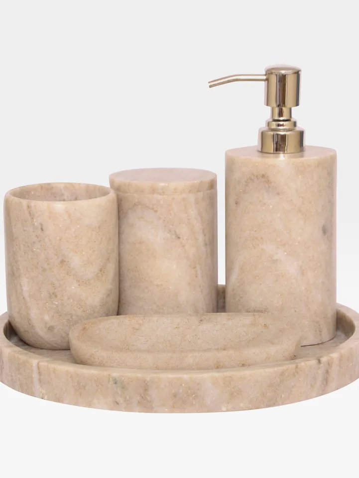 Set includes a soap pump, soap dish, toothbrush holder, box and tray.