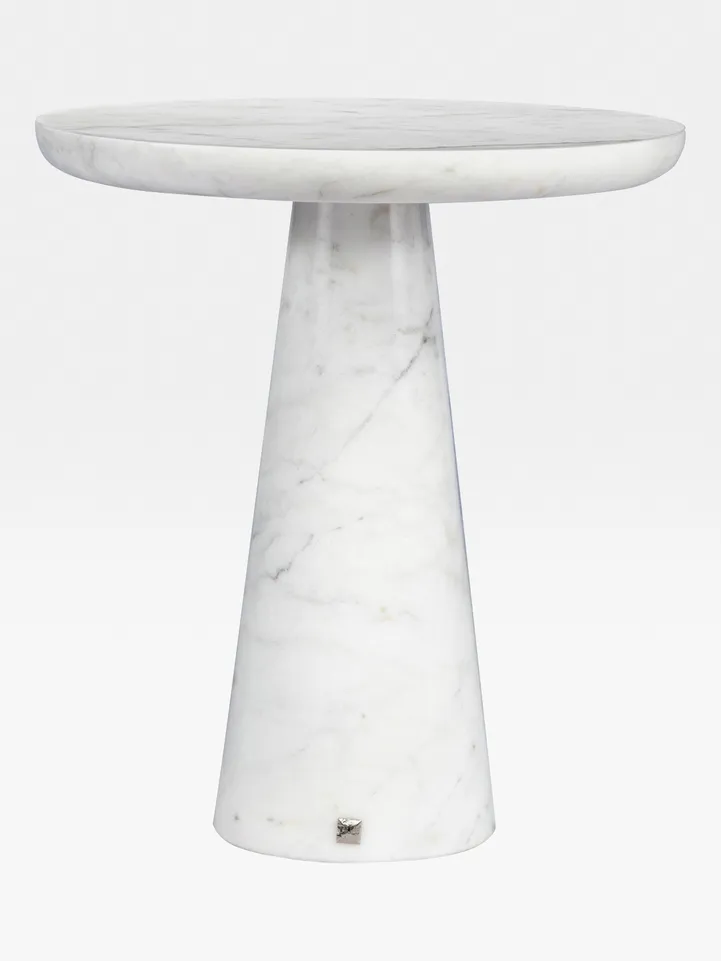 ROCI side table in White marble features a gracefully tapered base and round top, embodying timeless elegance that complements any decor. Its pristine white hue adds purity and sophistication.