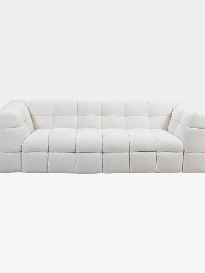 The SOPHIA envelops you in deep-seated comfort with its luxurious embossed white fabric upholstery and distinctive square tufting. This sofa exudes timeless elegance and grandeur, perfect for creating your ideal sectional arrangement.