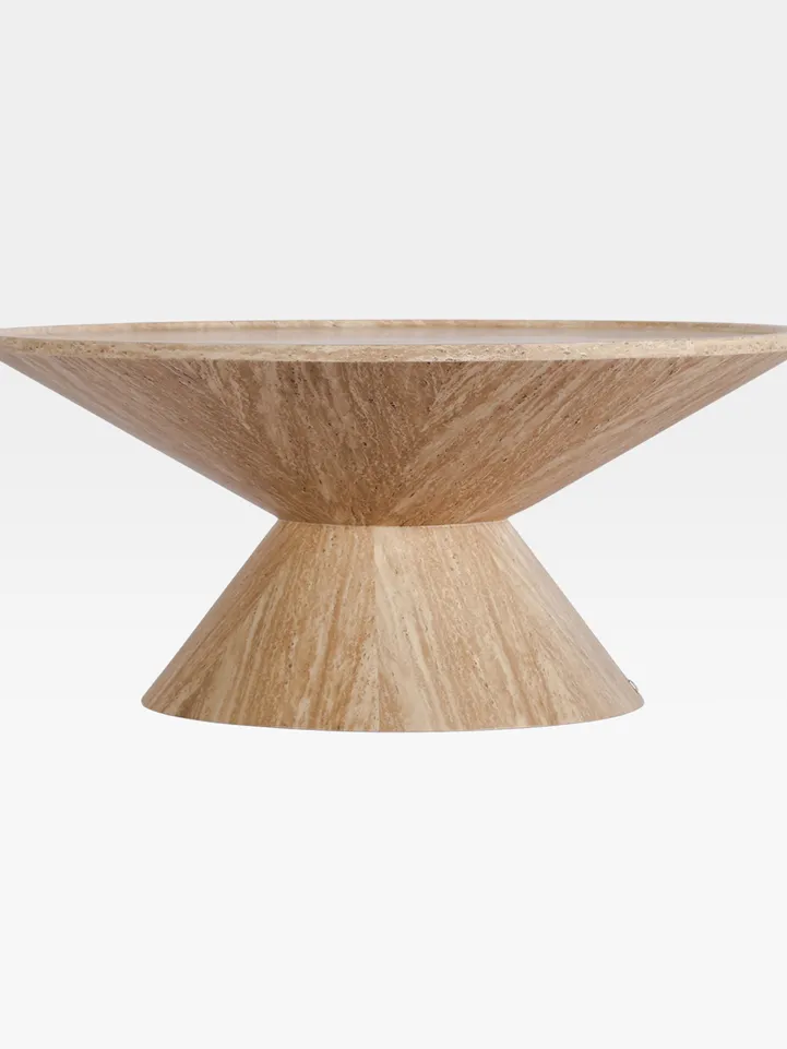 VIOLTO coffee table, with its unique organic silhouette, is exquisitely crafted from travertine paper veneer. Its bold, sculptural base creates a striking visual statement, seamlessly blending modern artistry with a natural, earthy elegance.